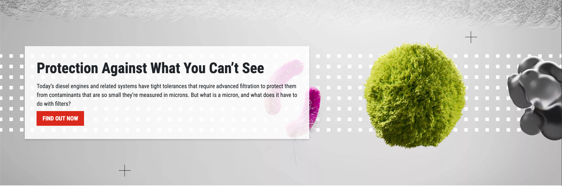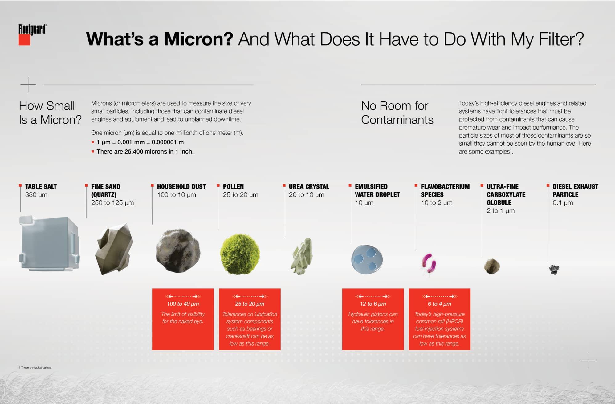 In real life, in harsh jobsite conditions and at full speed along a highway, ensuring that diesel engines and equipment operate efficiently and when needed can be a challenge — especially when particles too small for an operator or a service technician to see can infiltrate air intakes, fuel tanks and injectors. These contaminants are so small they are measured in microns, one of which is equal to one-millionth of one meter (0.000001 m).